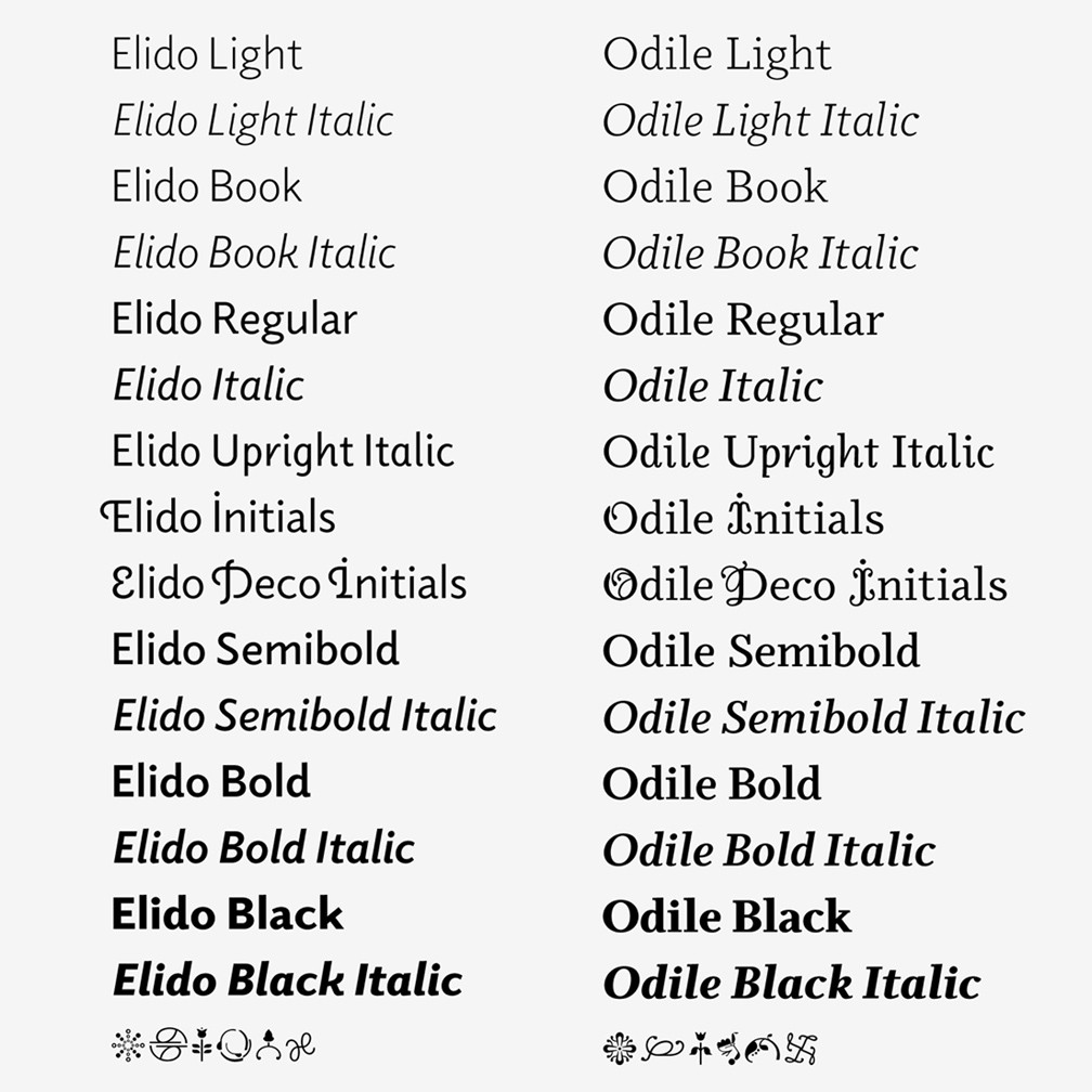 Odile’s conceptual approach is echoed in the structure and anatomy of the Elido family. The arched stroke low off the stem reveals a script characteristic most pronounced in the Elido Upright Italic. This particular interpretation is gradually diminished in the Italic and becomes even less emphasized in the Regular style. Six balanced weights, from an elegant Light to a pronounced Black, are in tune with three display solutions and a set of beautiful Ornaments.